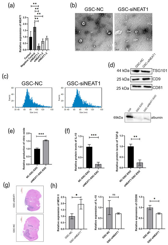 (a) NEAT1 siRNAs are transfected into the GSCs and then the expression of NEAT1 is assessed by qRT-PCR analysis. GAPDH is used as a reference gene (n = 3); (b) representative image of electron microscope of exosomes collected from the culture medium of GSC-NC and GSC-siNEAT1 cells; (c) particle size map of exosomes from GSC-NC and GSC-siNEAT1 cells. (d) Proteins are extracted from the exosomes of GSC-NC and GSC-siNEAT1 and the expression of CD9, CD81, TSG101, and albumin are determined by Western blot analysis; (e) relative quantitative results of the Griess experiment in the culture medium of GSC-NC-EXO and GSC-siNEAT1-EXO (n = 3); (f) relative quantitative results of ELISA experiment of TGF-β and IL10 protein levels in the culture medium of GSC-NC and GSC-siNEAT1 cells (n = 3); (g) HE staining image of mice tumor section; (h) relative quantitative results of qRT-PCR analysis of the expression MCH II, IL10, and CD206 in macrophages in tumors from different groups of mice;. GAPDH is used as a reference gene (n = 3). Data are presented as the mean ± S.D. p-value is determined by Student’s t-test or ordinary one-way ANOVA (* p < 0.05, ** p < 0.01, *** p < 0.001, ns = not significant).