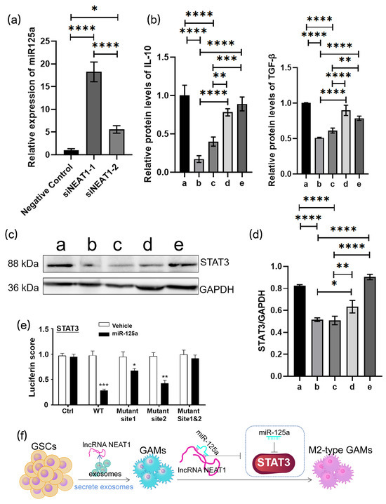 NEAT1 delivered by exosomes promotes the M2 polarization of macrophages: (a) relative quantitative results of qRT-PCR analysis of the expression miR-125a in si-NC or siNEAT1 BMDMs. U6 is used as a reference gene (n = 3); (b) relative quantitative results of ELISA experiment of TGF-β and IL10 protein levels in the culture medium of different groups of BMDMs (a: negative control, b: siNEAT1-1, c: siNEAT1-2, d: siNEAT1-1+miR125a inhibitor, e: siNEAT1-2+miR125a inhibitor) (n = 3); (c) protein levels of STAT3 of different groups of BMDMs are determined by Western blot (a: negative control, b: siNEAT1-1, c: siNEAT1-2, d: siNEAT1-1+miR125a inhibitor, e: siNEAT1-2+miR125a inhibitor); (d) quantitative results of Western blot analysis are shown (n = 3); (e) MiR-125a mimics and reporter plasmids containing the wild type or mutant form of STAT3 3′UTR are co-transfected into the BMDMs, and then the luciferase activity is assessed after 48 h transfection. Expression of STAT3 is shown. (f) The mechanistic scheme of GSC-derived exosomes remodeled GAMs by delivering lncRNA NEAT1 to GAMs and regulating the NEAT1/miR-125a/STAT3 pathway. Data are presented as the mean ± S.D. p-value is determined by ordinary one-way ANOVA (* p < 0.05, ** p < 0.01, *** p < 0.001, **** p < 0.0001).