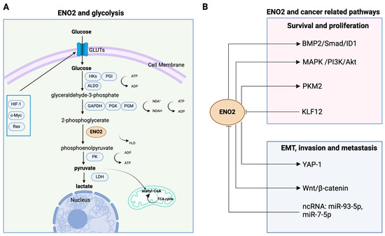 Schematic representation of the pleiotropic roles of ENO2 in cancer glycolysis and multiple pathways. (A) Enolase 2 catalyses the conversion of 2-phosphoglycerate into phosphoenolpyruvate and governs a critical step in the aerobic glycolytic pathway that converts glucose into pyruvate and ultimately into lactate. (B) In cancer cells, ENO2 plays diverse non-glycolytic roles, mediating cell proliferation, survival, EMT, invasion, and metastasis. ENO2 promotes cell proliferation and survival by activating PMK2, MAPK/PI3K/Akt, and BMP2/Smad/ID1 pathways. In addition, ENO2 augments tumour invasion and metastasis by regulating EMT via the YAP-1 and Wnt/β-catenin axis. Moreover, the activity of ENO2 can be affected by noncoding RNAs (e.g., miR-93-5p, miR-7-5p) and transcription factors such as KLF12. (Created with BioRender.com, agreement number: EH270PU3J9.).