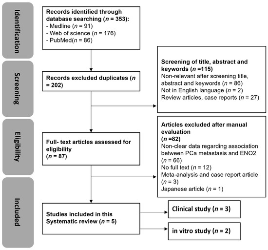 A protocol was conducted in accordance with the purpose-driven hypothesis. The Preferred Reporting Items for Systematic Reviews and Meta-Analyses (PRISMA) guidelines were utilised as a reference for this review. Keyword searches for “prostate cancer”, “prostate carcinoma”, “prostate neoplasm”, “ENO2”, “enolase 2”, “gamma enolase”, “neuron-specific enolase”, “nervous system-specific enolase”, “neuronal enriched enolase”, “2-phosphoglycerate dehydratase”, and “metastasis” were carried out using Web of Science, Medline, and PubMed. The developed search strategies for Web of Science, Medline, and PubMed are shown in Supplementary Table S1. Relevant articles were individually screened based on search strategy terms. Duplications were automatically removed using EndNote 20.6 (Clarivate Analytics, Philadelphia, PA, USA, 2023).