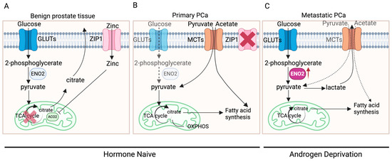 The distinctive metabolic pattern of prostate cells might be a primary factor contributing to alterations in ENO2 expression. Normal prostate epithelial cells typically exhibit citrate-based metabolism, characterised by a relatively inefficient energy metabolic pattern using glucose and aspartic acid to synthesise citrate, an important component of prostatic fluid, and the final product of anaerobic glycolysis [6,35,36]. However, in the initiation and development of PCa, there are two metabolic switches: a conversion from anaerobic glycolysis to oxidative phosphorylation (OXPHOS) (benign prostate tissue to primary cancer) and a transition from OXPHOS to aerobic glycolysis and fatty acid synthesis (primary to advanced cancer) (Figure 3) [36]. During these switches, there are elements that have been identified to be key to the process, including AR, zinc transporter (ZIP1), and monocarboxylate transporters (MCTs).