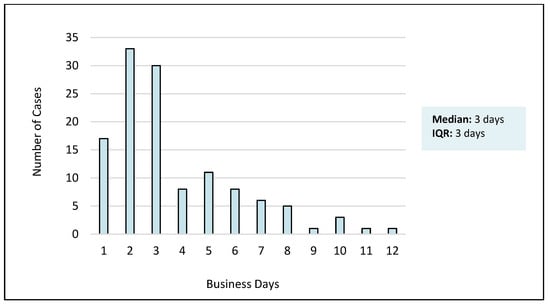 The median turnaround time for liquid biopsy was 3 business days (interquartile range 2–5 business days). A total of 17 (14%) cases had a turnaround time of 1 day, and 80 cases (65%) were reported in 3 days or less. Turnaround time data are summarized in Figure 1.