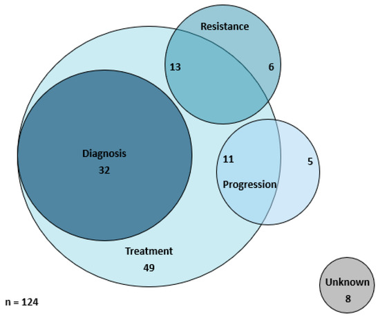 Utilization patterns of liquid biopsy. Of 124 liquid biopsies, 32 were initiated to inform diagnoses and treatment investigations, 13 to inform resistance and treatment investigations, 11 to inform progression and treatment investigations, 49 to inform treatment investigations only, 6 to inform resistance investigations only, 5 to inform progression investigations only, and 8 for unknown reasons.