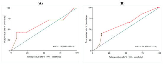 AUC for differentiating progressive from stable disease (A) at the time of NETest collection and (B) during follow-up in patients with metastatic Si-NENs.