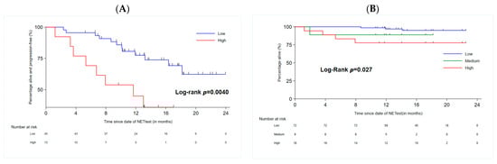 The UVA and MVA demonstrated that the NETest value (HR: 1.032, 95% CI: 1.003–1.062, p = 0.033), the high-risk NETest category (HR: 10.5, 95% CI: 1.35–81.7, p = 0.025), the presence of lung metastases (HR: 5.21, 95% CI: 1.12–24.3, p = 0.035), CgA levels > 10 × ULN (HR: 17.4, 95% CI: 3.21–93.7, p = 0.001), and TGR (HR: 2.469, 95% CI: 1.186–5.139, p = 0.016) were statistically significantly and independently associated with shorter PFS (Table 3). The related Kaplan–Meier curves are shown in Figure 2A.