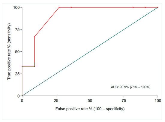 Of the 11 (69%) patients classified as belonging to the low-risk category, all except 2 remained free of disease during the follow-up time. The patient that was classified as belonging to the medium-NETest-risk category displayed disease recurrence on follow-up imaging. The two patients with high NETest scores (86.7% and 100%) had no evidence of disease recurrence on the 68Ga-DOTATATE PET performed at one year follow-up while one of them displayed disease recurrence on conventional cross-sectional imaging. The AUC for predicting disease recurrence at one-year follow-up after surgery was 0.909 (95% CI: 0.75–0.100) (Figure 3).