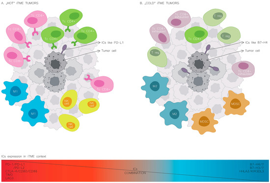 Cold and hot immune tumour microenvironment. The leading cellular players shaping iTME composition in the hot tumour phenotype (A) and the cold tumour phenotype (B). NK, natural killer cells; M1, macrophages of type 1; M2, macrophages of type 2; MDSC, myeloid-derived suppressor cells; Tc CD8, T cells CD8 lymphocytes; Tc CD4, T cells CD4 lymphocytes; T reg, regulator T cells; PD-L1, programmed cell death-ligand 1; B7H4, B7 homolog 4.