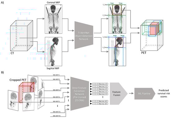 Overview of the proposed method for fully automated segmentation-free outcome prediction for head and neck cancer patients. (A) Overall representation of the automated head and neck region detection and cropping. (B) Extracting deep features from MA-MIP projections followed by feature fusion step.