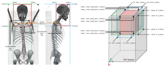 Visual summary of the proposed bounding box definition and cropping for locating the anatomical head and neck region on the PET volumes of the patients based on the coronal and sagittal MIP CT projections. Locating the bounding boxes on coronal and sagittal CT MIPs based on the AC and SC clavicle joints (left), and the 3D bounding box cropping on the PET volume based on the two 2D bounding boxes on the CT mips (right).