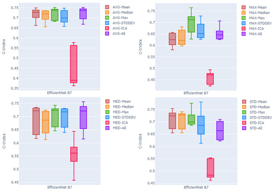 Comparing feature fusion methods, the independent component analysis (ICA) method seems to work poorly with respect to other fusion methods ( on average over four pooling methods and three backbone sizes). Among two other fusion methods, on average, statistical summarization methods seems to outperform non-linear transformation method (auto-encoder) with the mean value over all five channel-wise methods equal to compared to for the auto-encoder. Between the four statistical summarization fusion methods, channel-wise maximum fusion with the mean c-index of 0.686 outperforms other methods with mean c-indices of , , and for channel-wise standard deviation, mean, and median, respectively. Comparing the effect of using the EfficientNet as a feature extraction backbone with different sizes, looking at the average of the c-index values over all the proposed pooling and fusion methods, EfficientNet Large (B7) and EfficientNet Small (B1) with mean c-indices of and respectively, slightly outperform the EfficientNet Medium (B4) with the mean c-index of , with the large size performing minimally better than EfficientNet Small.