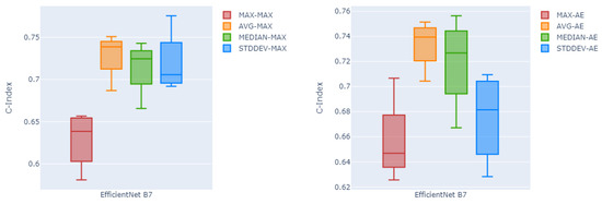 Likewise, Figure 4 shows in box plots the performance of the channel-wise maximum fusion technique and the auto-encoder as the two best fusion methods over all four different global pooling methods, over all five testing folds. Here as can be seen, global average pooling has a higher median c-index and lower variability compared to the other three pooling methods on both channel-wise maximum fusion and the auto-encoder.