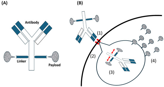 As shown in Figure 1A, the antibodies in ADCs are responsible for target recognition and delivery. The small-molecule drugs as payloads are responsible for drug efficacy. The stability of the linker in vivo ensures that cytotoxic molecules are not launched prematurely and drug cleavage occurs only when it enters the tumor, preventing systemic toxicity [30,31,32].