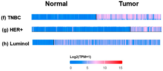 - Jézéquel, P.; Campone, M.; Gouraud, W.; Guérin-Charbonnel, C.; Leux, C.; Ricolleau, G.; Campion, L. bc-GenExMiner: An easy-to-use online platform for gene prognostic analyses in breast cancer. Breast Cancer Res. Treat 2012, 131, 765–775. [Google Scholar] [CrossRef] [PubMed]