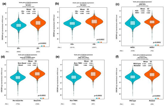 The log2 standardized mRNA expression of CDC20 was investigated to evaluate factors such as the expression of the hormone receptors and BC1/2 mutation (Figure 3). As shown in Figure 3a–c, the expression of CDC20 was significantly upregulated (p < 0.0001) in patients diagnosed with ER−, PR−, and HER− compared to ER+, PR+, and HER2+ patients, respectively. These findings were consistent with the highly upregulated expression of CDC20 in patients with both basal and TNBC subtypes compared to non-basal and non-TNBC (p < 0.0001, Figure 3d and e, respectively). Furthermore, BC patients with mutated BC1/2 have shown high expression of the CDC20 mRNA compared with the wild-type diagnosed patients (p < 0.0001, Figure 3f).