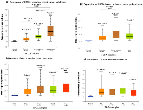 We investigated the expression of CDC20 in several clinicopathological features in BC, including subtype, race, stage, and nodal metastasis (Figure 4). Data from TCGA and UALCAN showed a significantly elevated level of CDC20 (p < 1 × 10−12) in the most aggressive TNBC subtype patients (Figure 4a) patients with African American origin compared to the Caucasian and Asian racial groups (p < 1 × 10−12, Figure 4b). The four stages of BC progression showed significant CDC20 overexpression. Meanwhile, stage 1 revealed the most significant upregulated level of CDC20 (p < 1 × 10−12, Figure 4c) compared to the normal breast tissue. Consistently, this upregulation in CDC20 expression was also in parallel to its upregulation in the four metastatic nodals (N0, N1, N2, and N3), giving the highest level at the first three nodal stages and an outstanding significance in N1 (p < 0.0001, Figure 4d). In brief, these results confirmed high expression in CDC20, particularly in TNBC, the African American race, at all stages of grades and nodal metastasis.