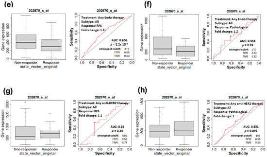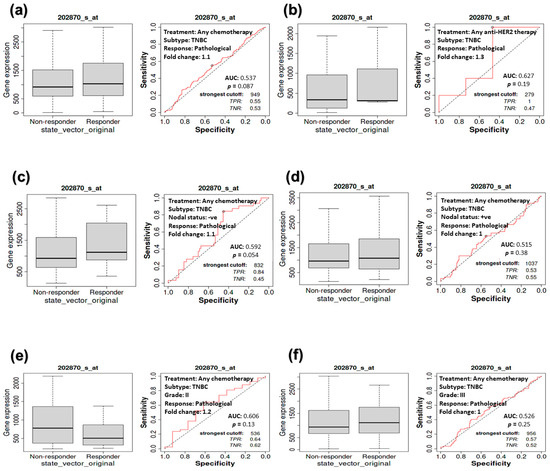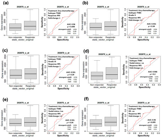 The KM plot of survival was used to examine the relationship between CDC20 expression and CPR, specifically in TNBC. For further validation, we performed ROC analysis to determine the predictive biomarkers in BC. CDC20 mRNA overexpression in TNBC subtypes was linked to a worse prognosis. From the TNBC patients’ data analysis, no significant difference (p > 0.05) was found between the responder to therapy compared to the non-responder, respectively, in the following groups: TNBC patients who received any chemotherapy (Figure 6a, median of 1028, n = 5016 vs. 919, n = 4492), or anti-HER2 therapy (Figure 6b; median of 318, n = 2157 vs. 337, n = 1940), TNBC patients with negative nodal (Figure 6c, median of 1118, n = 3858 vs. 932, n = 3680) or positive nodal (Figure 6d; median of 1076, n = 5016 vs. 966, n = 4492), as well as grade II (Figure 6e; median of 507, n = 2560 vs. 776, n = 3680) and grade III (Figure 6f; median of 1113, n = 5016 vs. 934, n = 4492). In other TNBC patient groups who received any of the previously mentioned therapies or at the mentioned states of the disease or stage, no significant relationship was found between CDC20 expression and CPR (Figure 6a–f; p > 0.5). (https://rocplot.org/site/treatment) [28].