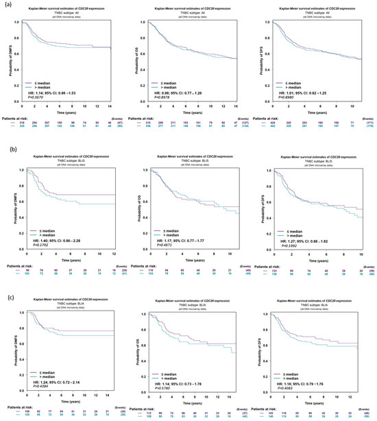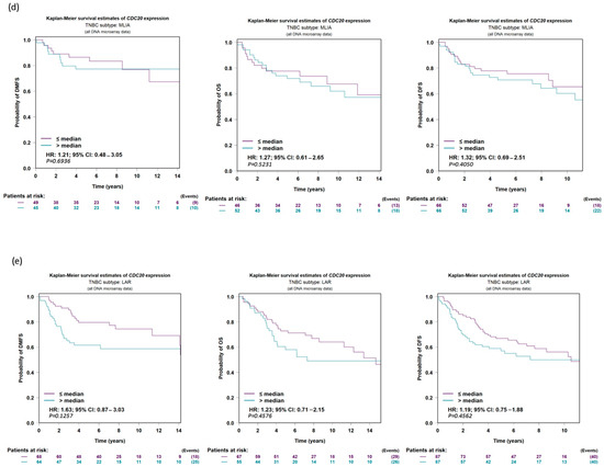 The data analysis program bc-GenExMiner v5.0 was used to establish a prognostic analysis of IHC subtypes of TNBC. The UALCAN data presented on KM plot did not show any significant difference (p-value > 0.10) between low and high CDC20 expression in relation to DMFS, OS, or DFS in the five following groups of TNBC: all TNBC subtypes (Figure 8a), basal-like immune-suppressed (BLIS, Figure 8b), basal-like immune-activated (BLIA, Figure 8c), mesenchymal-like immune-activated (MLIA, Figure 8d), and luminal androgen receptor (LAR, Figure 8e). Thus, the change in overexpression of CDC20 is not associated with the prognosis in TNBC histochemical subtypes.