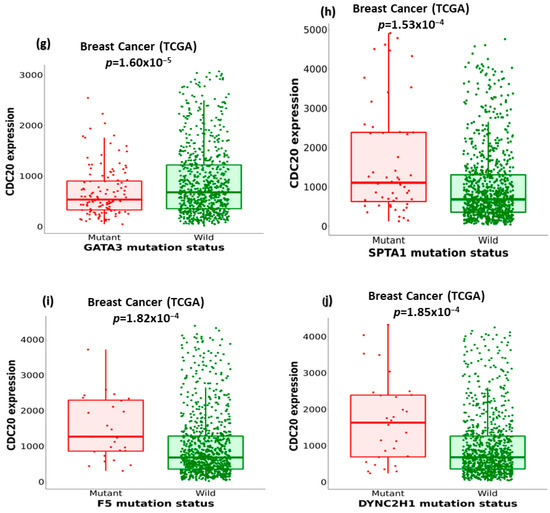 We compared the expression of CDC20 in wild-type BC to its expression in ten of the commonly mutated forms of proteins and genes other than BC1/2 (Figure 9). The investigation included tumor protein P53 (TP53), cadherin-1 (CDH1), phosphoinositide-3-kinase, catalytic, alpha polypeptide (PIK3CA), mitogen-activated protein kinase-1 (MAP3K1), FAT atypical cadherin 3 (FAT3), reelin (RELN), GATA binding protein 3 (GATA3), spectrin alpha, erythrocytic 1 (SPTA1), coagulation factor V (F5), and cytoplasmic dynein 2 heavy chain 1 (DYNC2H1) (Figure 9a–j). In BC, the mutated TP53, FAT3, RELN, SPTA1, F5, and DYNC2H1 genes showed overexpression of CDC20. Meanwhile, tumors with CDH1, PIK3CA, MAP3K1, and GATA3 genes were accompanied by downregulation of CDC20.