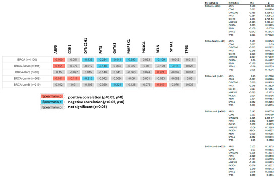 The relationship between mutated genes and CDC20 expression in different subtypes of BC. The positive (red) and negative (blue) correlation between the commonly mutated genes and CDC20 in all BC subtypes: BRICA-BASAL, BRICA-HER2, BRICA-LUMA, and BRICA-BUMB using the non-parametric test Spearman’s rho. p > 0.05 is a non-significant difference.