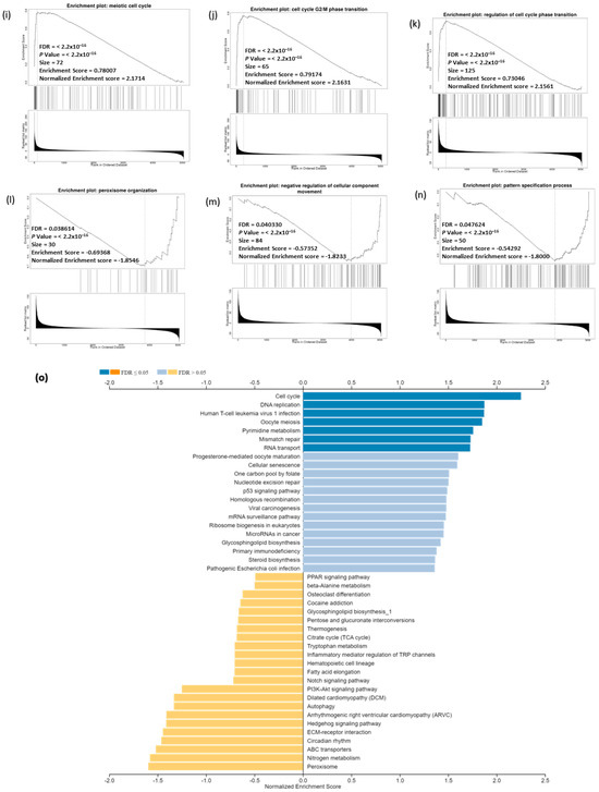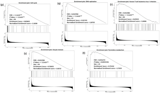 The GSEA tool was also used to probe the KEGG database and identify the enriched biological pathways (Figure 11o). The significant pathways enrichment was again found in the cell cycle (hsa04110) and DNA replication (hsa03030), in addition to other related pathways including, human T-cell leukemia virus 1 infection (hsa05166), oocyte meiosis (hsa04114), pyrimidine metabolism (hsa00240) (Figure 11p–t). Interestingly, no significant enriched pathways were recognized for genes positively co-expressed with CDC20.