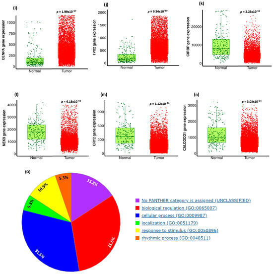 We utilized UALCAN and PANTHER databases to explore and functionally classify the genes correlated with CDC20 expression in BC (Figure 12). In relation to CDC20 expression, heatmaps showed the most related genes positive (YBX1 and TUBA1C) or negative (XBP1 and CIRSP) (Figure 12a,b). In comparison with the normal breast tissues, the most upregulated eight genes in BC tissues, with the corresponding fold-change, are shown in Figure 12c–j as follows: UB1 (4.05-folds), KIF20A (4.86-folds), CCNB2 (4.03-folds), NDC80 (5.79-folds), AURKB (2.98-folds), CDCA8 (4.57-folds), CENPA (3.51-folds), and TPX2 (3.94-folds). The top four significantly downregulated genes were CIRBP, NEK9, CRY2, and CALCOCO1 (Figure 12k–n). Another tool, PANTHER, was accessed to identify and classify the different biological processes controlled by these genes. The generated data presented in the pie chart indicated that the biological regulation (31%) and cellular process (31.6%) genes were the most prevalent genes associated with CDC20 expression in BC (Figure 12o).