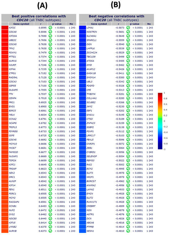 In the investigation of TNBC cells, a microarray of genes using immunochemistry (IHC) and bc-GenExMiner module was employed to explore the most positively and negatively correlated gene expression with CDC20 (Figure 13). The gradient color scale on the right demonstrated the score codes for the top fifty genes, with +/− r values of correlation, respectively. Among those positively linked to CDC20, we found KIF2C and CDCA8 the top two genes on the list (r = 0.8595, 0.8086, respectively), whereas LMNB2 and AURKB were the least (r = 0.6378 and 0.6373, respectively) (Figure 13A). On the other hand, the negative correlation with CDC20 presented in Figure 13B denoted LIMA1 (r = −0.5873) and SESN1 (r = −0.481) as the highest and lowest negatively correlated gene, respectively.