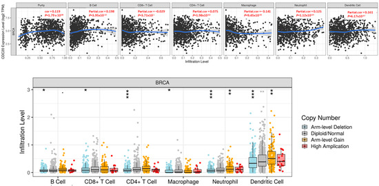 The the online resource TIMER2.0 allowed us to establish a systematic analysis of immune infiltrates from TCGA (https://cistrome.shinyapps.io/timer/, accessed on 4 March 2023) [37]. TIMER2.0 speculates the abundance of tumor-infiltrating immune cells from the gene expression profile [38]. The gene module allows us to select CDC20 and visualize the correlation of its expression with immune infiltration levels in BC. We investigated the correlation of CDC20 expression with the abundance of immune infiltrates, including B cells, CD4+ T cells, CD8+T cells, neutrophils, macrophages, and dendritic cells in BC. The somatic copy number alterations (SCNAs) module was used to compare tumor infiltration levels among tumors with different SCNAs for a given gene. Genomic Identification of Significant Targets in Cancer (GISTIC 2.0) was used to identify genes targeted by SCNAs in cancer. The P-values and partial correlation values were obtained using a purity-adjusted Spearman’s rank correlation test. Heatmaps and scatter diagrams were also obtained. Box plots were presented to show the distributions of each immune subset at each copy number status in BC. The infiltration level for each SCNA category is compared with the normal using a two-sided Wilcoxon rank sum test.