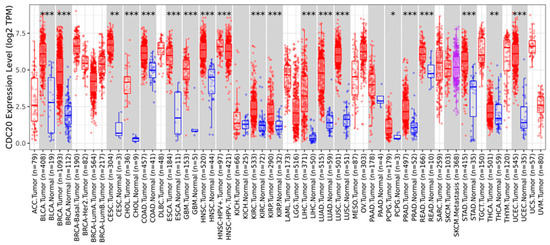 Expression profile of CDC20 in several types of cancer. Distributions of gene expression levels compared to normal tissues and boxplots of up- and downregulated genes for each cancer type in gray columns when normal data were available. Data were generated using the TIMER 2.0 database. BLCA; bladder urothelial carcinomas, BC; breast invasive carcinoma, CHOL; cholangiocarcinoma, COAD; colon adenocarcinoma, ESCA; esophageal carcinomas, GBM; glioblastoma multiforme, HNSC; head–neck squamous cell carcinoma, HNSC-HPV+; head–neck squamous cell carcinoma–human papillomavirus+, HNSC-HPV-; head–neck squamous cell carcinoma–human papillomavirus-, KIRC; kidney renal clear cell carcinomas, KIRP; kidney renal papillary cell carcinomas, LIHC; liver hepatocellular carcinoma, LUAD; lung adenocarcinoma, LUSC; lung squamous cell carcinomas, PRAD; prostate adenocarcinoma, READ; rectum adenocarcinoma, STAD; stomach adenocarcinomas, UCEC; uterine corpus endometrial carcinoma, CESC; cervical squamous cell carcinoma, THCA; thyroid carcinomas, PCPG; pheochromocytoma and paraganglioma, KICH; kidney chromophobe, SKCM; skin cutaneous melanoma cancers. p-value; * < 0.05, ** < 0.01, *** < 0.001.