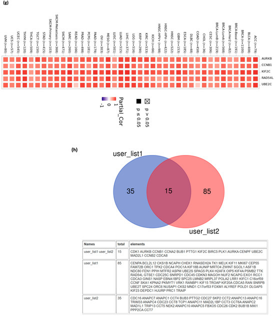 To study how CDC20 gene expression is related to tumorigenesis, we screened CDC20-binding proteins and CDC20 expression-related genes. A series of pathway and function enrichment analyses were conducted. The STRING tool was used to screen the top fifty CDC20 binding proteins. Figure 16a shows the interaction network of these fifty proteins. Next, we obtained the top 100 genes related to CDC20 expression using all tumor expression databases of TCGA and the GEPIA2 tool. As shown in Figure 16b–f, the expression level of CDC20 was significantly (p = 0.0) and positively correlated with genes encoding Kinesin Family Member 2C (KIF2C; r = 0.84), Aurora Kinase B (AURKB; r = 0.78), RAD54 Like (RAD54L; r = 0.77), Cyclin B1 (CCNB1; r = 0.77), Ubiquitin Conjugating Enzyme E2C (UBE2C; r = 0.77). The corresponding heatmap data (Figure 16g) also showed that the expression level of CDC20 was positively correlated with the above five genes in most tumor types. The top 50 CDC20 binding proteins and the top 100 CDC20 expression-linked-genes were cross-analyzed to generate fifteen common genes, presented in the Venn diagram (Figure 16h).