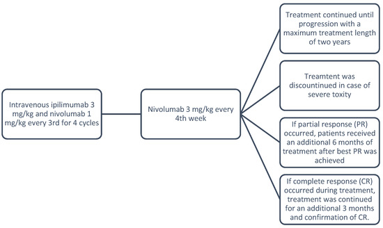 Danish patients received intravenous ipilimumab 3 mg/kg in combination with nivolumab 1 mg/kg every third week for 4 cycles. Hereafter, nivolumab 3 mg/kg was administered every fourth week. Treatment continued until progression or unacceptable toxicity. Treatment response was assessed every 12 weeks using brain MR-I and positron emission tomography–computed tomography (PET/CT) scans.