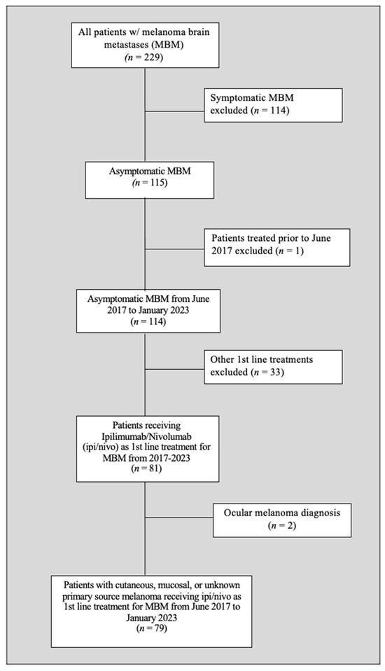 Between 1 June 2017 and 1 January 2023, seventy-nine patients with asymptomatic MBM were treated with ipi/nivo at four different treatment sites in Denmark.