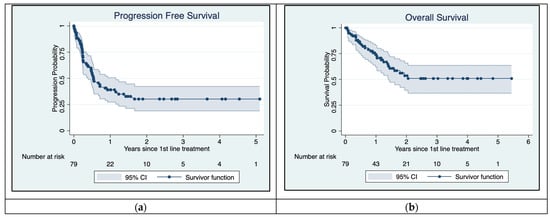 Kaplan–Meier plots for Progression-Free Survival (a) and overall survival (b). Median PFS is approximately 6.5 months. Median overall survival has not yet been reached.