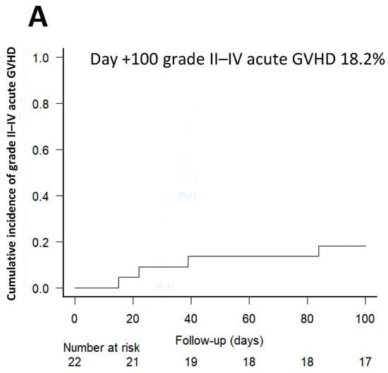 At day +100, the cumulative incidences of grades II–IV and III–IV acute GVHD were 18.2% (95% CI, 5.5–36.8) and 4.5% (95% CI, 0.3–19.4), respectively (Figure 1A,B). Two patients presented acute GVHD intestinal involvement. GVHD were treated following standard guidelines. In patients with aGVHD, tacrolimus was maintained at therapeutic levels in all cases and treatment with 2 mg/kg/day of corticosteroids were initiated in all patients with grades II–IV aGVHD. No grade IV acute GVHD or steroid-refractory disease was observed. The cumulative incidences of all-grade and moderate-severe chronic GVHD at 1 year were 11.4% (95% CI, 17.0–31.6) and 6.4% (95% CI, 0.4–26.2) (Figure 1C). One patient was presented with moderate/severe cGVHD requiring first-line treatment with corticosteroids and calcineurin inhibitors with stabilization of the cGVHD.