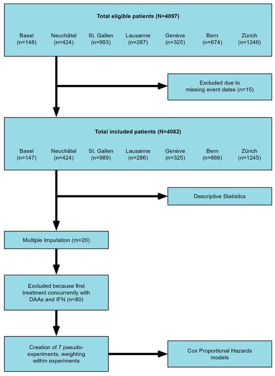 The imputation models incorporated relevant information on variables including patient sex, study center, age at enrollment, diabetes status, drinking history, patient height, weight, body mass index (BMI), HIV status, anti-HBc and HBsAg status, liver stiffness assessed by transient elastography, cirrhosis status, Child–Pugh score, history of intrahepatic tumors (IHT) or extrahepatic tumors (EHT), and platelet count. The available evidence supports employing the outcome in the process of multiple imputation for covariates []. Therefore, the occurrence of each examined event type during the observation time (IHT, EHT, death) as well as ln(time) until the event was used in the imputation models. To investigate whether the risk of IHT occurrence and the risk of death are different in patients treated with DAAs compared with untreated patients and patients treated with IFN-based therapy, a semiparametric competing risk proportional hazards regression model was calculated. Patients who received first-generation DAAs at the same time as IFN for their first treatment past enrollment were removed from the analysis. Additional information regarding the approach taken to manage diverse treatment regimens adopted during the follow up is provided in the Supplementary Materials.