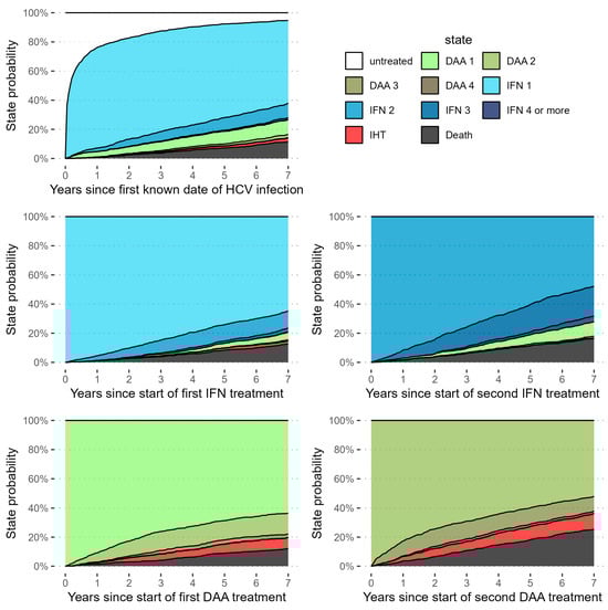 Graphical representation of the simulated state probabilities over time for a “high risk” hypothetical patient, with liver stiffness fixed at high risk (>9.6) or cirrhosis, and a BMI in the 75th quantile. It can be seen that, in this group, rates of IHT over time are likely not only higher for patients treated with DAAs, but also for those treated with repeated lines of DAAs.