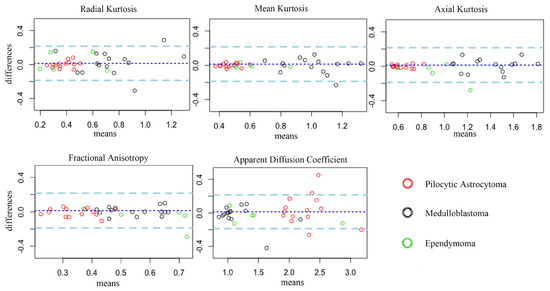 Bland–Altman plots of the mean versus differences of the tumoral volume measurements of the two readers for each DKI and DTI metric. Black dots represent patients affected by medulloblastoma (MB), red dots represent patients affected by pilocytic astrocytoma (PA), and green dots represent patients affected by ependymoma (EP). VOI-based measurements presented good to excellent repeatability across all metrics. All metrics were useful for the differentiation of PA (red dots) versus MB (black dots). RK, MK, and AK were useful for the differentiation of EP (green dots) versus MB (black dots). AK, FA, and ADC were useful for the differentiation of PA (red dots) versus EP (green dots).