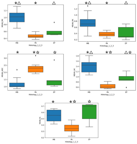 Boxplots of the mean of different DKI metrics (MK, RK, AK, ADC, and FA) related to each subgroup in the dataset. Significant differences among MB and PA, MB and EP, and EP and PA were marked with an asterisk, a triangle, and a star, respectively.