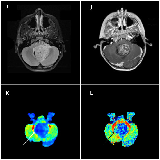 - Jaremko, J.L.; Jans, L.B.; Coleman, L.T.; Ditchfield, M.R. Value and limitations of diffusion-weighted imaging in grading and diagnosis of pediatric posterior fossa tumors. AJNR Am. J. Neuroradiol. 2010, 31, 1613–1616, Erratum in AJNR Am. J. Neuroradiol. 2010, 31, E90. [Google Scholar] [CrossRef] [PubMed]