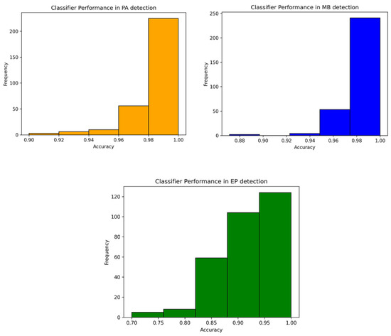Histogram plots illustrating the performance of classifiers over 300 iterations in the machine learning analysis for the detection of the three tumor subgroups, pilocytic astrocytoma (PA, in orange), medulloblastoma (MB, in blue), and ependymoma (EP, in green). These boxplots show a more robust performance in MB and PA detection, compared to EP.
