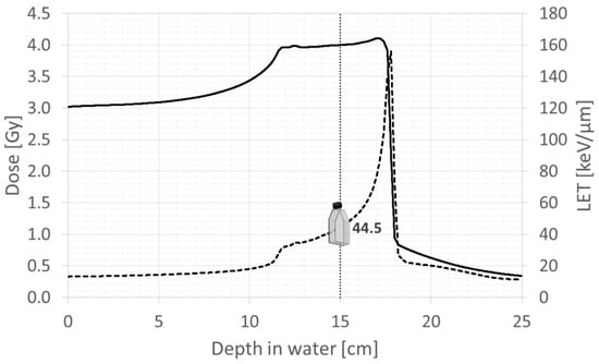 Before irradiation, scaffolds were placed in flasks (Corning, Milan, Italy), and the medium was added to completely cover them when placed either in a vertical (in the case of CIRT), or horizontal position (for X-RT). Scaffolds were exposed to 2 Gy and 4 Gy for both radiation types for both low- (X-RT) and high-LET (CIRT), which were quantified as 0.2 keV/μm [15] and 44.5 keV/μm, respectively (RayStation V11B, RaySearch Laboratories, Stockholm, Sweden) (Figure 1). Within the scope of our study, the LET of 44.5 keV/μm provided a clinically pertinent condition, supporting our goal to effectively differentiate between low and high LET. The selected SOBP extensions reflected clinically relevant irradiation beams, ensuring that our experimental conditions applied to therapeutic settings.
