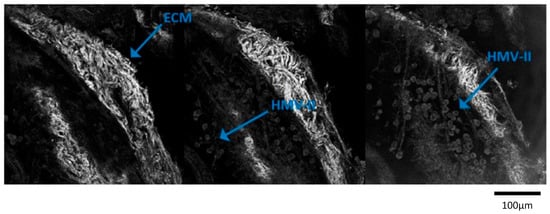 Images at different depths of scaffolds seeded with HMV-II cells were obtained with confocal microscopy to evaluate whether and how cancer cells populated the scaffold. The figure showed that cells were able to intercalate deeper in the structure of the bioscaffolds from the surface through the decellularized extracellular matrix (ECM). This image was captured at three different successive planes. Scale bar: 100 µm.