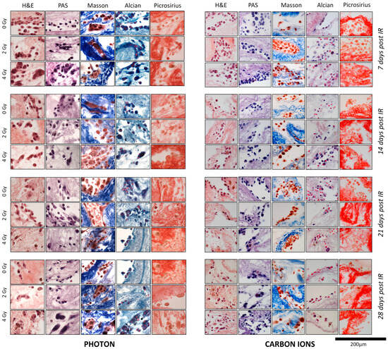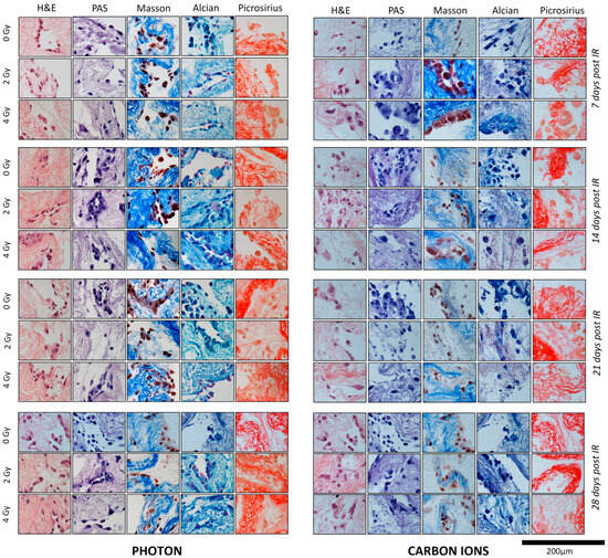 Figure 4. Histological sections of scaffolds seeded with PANC-1 cells, after photon (left) and carbon ion irradiation (right) at each time point. To evaluate the effects of different irradiation (IR) conditions, the histological sections of populated scaffolds at 7, 14, 21, and 28 days were stained with hematoxylin and eosin (H&E), periodic acid-Schiff (PAS), Masson’s trichrome, Alcian blue, and picrosirius red (PSR). At 28 days, the experiments were conducted in parallel; thus, the same control condition (0 Gy) was applied. Refer to Table 2 for the specific description of the histological characteristics of each section.