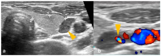The patient is scanned with mild neck extension using a linear array high-frequency probe (7.5–15 MHz) in transverse and longitudinal planes with a special focus behind the thyroid gland medial to the carotid and jugular vessels where the parathyroid glands are usually located [18]. The neck should be scanned from the carotid bifurcation to sternal notch and the paratracheal spaces, carotid-jugular axis, and thyroid gland should be included [79]. PA is a well-circumscribed, oval- or oblong-shaped, hypoechoic lesion compared to the adjacent thyroid gland, located posterior (more commonly), anterior or lateral to the thyroid at the superior/inferior polar regions, having an echogenic capsule, and shows an enlarged feeding inferior thyroidal artery (feeding vessel sign) on colour Doppler with a low resistive index on spectral Doppler [1,18]. Internal heterogeneity due to fat, calcifications or haemorrhage can be seen [1]. US of a PA is shown in Figure 1.