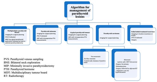Imaging plays a crucial role in recurrent disease. Morphological information, including anatomic localisation and the extent of the parathyroid lesion, is provided by ultrasound (US), including the recent contrast-enhanced US (CEUS), four-dimensional computed tomography (4DCT) and dynamic enhanced magnetic resonance imaging (4DMRI), whereas functional information is provided by radiolabelled Technetium-99 (99mTc) sestamibi or dual tracer 99mTc pertechnetate and 99mTc-sestamibi with or without single photon emission computed tomography (SPECT) or SPECT/CT and fluoro-choline positron emission tomography (18F-FCH PET or [11C]Methionine (11C-MET) PET [1,18,19]. Hybrid imaging such as 18F-FCH PET/4DCT and 18F-FCH PET/MRI can capture advantages of both structural and functional imaging [1]. Surgical removal is the mainstay treatment for parathyroid lesions, and precise localisation of abnormal parathyroid glands/parathyroid lesions on imaging is crucial to perform focussed surgeries such as minimally invasive parathyroidectomy (MIP) [4,20].
