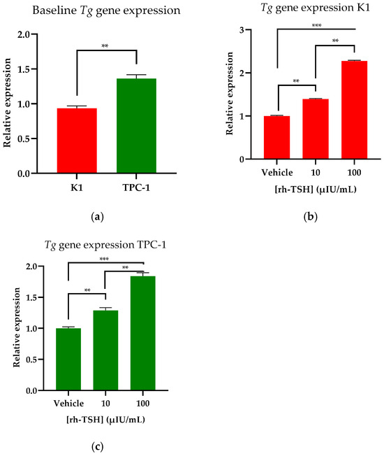 Thyroglobulin (Tg) gene expression determination of K1 and TPC-1 cells. (a) Using qRT-PCR, the baseline expression levels of the Tg mRNA of K1 (red bar) and TPC-1 cells (green bar) were assessed. (b) Following 48 h of treatment with the designated doses of rh-TSH, qRT-PCR was used to assess the effects of the hormone on Tg mRNA expression in K1 cells, while the same assay was performed in TPC-1 cells as well (c). All the samples were analyzed using Livak’s model, and beta-actin was used as a reference gene to normalize the data. All experiments were conducted in triplicate (n = 3), and each bar represents the average of the three experimental values. The error bars refer to the standard error of the mean (SEM). ** Corresponds to a p-value of <0.01; *** corresponds to a p-value of <0.001.