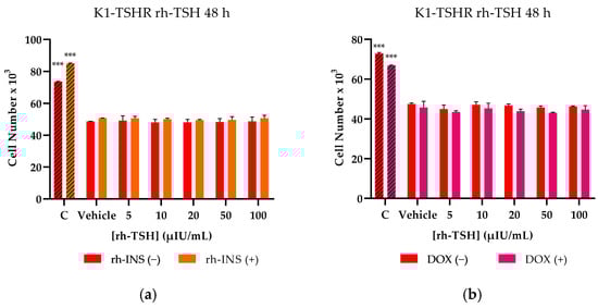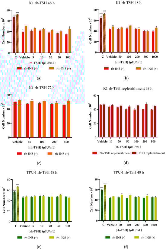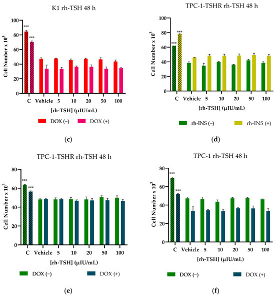 Proliferation assay of K1-TSHR and TPC-1-TSHR cells treated with rh-TSH and/or rh-INS. The transformed cells were seeded into microplates in a medium containing 3 μg/mL doxycycline (DOX), then, after 24 h of settling, attachment, and TSHR overexpression, the old medium was aspirated. An assay medium containing 2.5% FBS and the designated doses of the hormones (rh-TSH, h-INS) were added and left for 48 h. Wherever insulin is annotated (rh-INS), a concentration of 0.5 U/mL was used. As a positive control (striped bars, annotated as C) for elevated cell proliferation rates, a 10% FBS-containing medium was used, which has endogenous b-TSH, b-IGF1, insulin, and other cofactors. The vehicle-treated cells (annotated as Vehicle) were cultured in a 2.5% FBS-containing medium without added rh-TSH or rh-INS. A range of rh-TSH concentrations from 5 μIU/mL to 100 μIU/mL was tested in both transformed K1 (K1-TSHR) and TPC-1 (TPC-1-TSHR) cells. (a) The red bars represent rh-INS-untreated K1-TSHR cells, while the orange bars represent rh-INS-treated K1-TSHR cells. (b) As a control experiment, the effects of rh-TSH were also tested in both DOX-untreated (red bars) and DOX-treated (magenta bars) K1-TSHR cells. (c) The effects of DOX were also assessed in (untransformed) K1 cells: the red bars represent DOX-untreated K1 cells, while the purple bars represent DOX-treated K1 cells. The same set of experiments were performed in TPC-1/TPC-1-TSHR cells. (d) The dark green bars represent rh-INS-untreated TPC-1-TSHR cells, while the light green bars represent rh-INS-treated TPC-1-TSHR cells. (e) DOX-untreated TCP-1-TSHR cells are annotated as green bars, while DOX-treated TPC-1-TSHR cells are represented by blue bars. (f) The green bars correspond to DOX-untreated (untransformed) TPC-1 cells, while the blue bars correspond to DOX-treated TCP-1 cells. All experiments (a–f) were conducted in triplicate, and the error bars represent the standard error of the mean (SEM). The data analysis was performed using multiple t-tests, and no significant differences between the different rh-TSH concentrations were detected. Insulin-treated cells exhibited an overall increased cell number, which was statistically significant, as shown by a paired t-test (p-value < 0.001). *** Corresponds to a p-value of <0.001.
