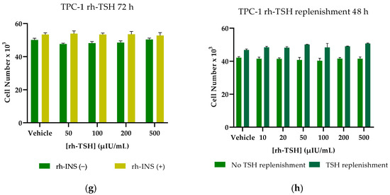 Regarding proliferation, K1 cells were incubated for 48 h with increasing concentrations of rh-TSH of 0, 1, 5, 10, 20, 50, and 100 μIU/mL in high-glucose DMEM (Figure 2a). A concentration of 2.5% FBS was used in all the proliferation experiments, as it was determined to be the minimum dose needed for sustaining cell survival and proliferation, thereby avoiding the possible masking effects of rh-TSH action by serum-contained bovine TSH (b-TSH) or other hormones (Figure A1a,b). Iodine intake has been found to be a limiting factor in thyroid cell proliferation (K1 and TPC-1) in in vitro settings [37]; therefore, it could not be absent. According to our data, no discernible differences in cell number were documented between the various rh-TSH concentrations; therefore, a range of higher concentrations between 100 and 1000 μIU/mL was tested (Figure 2b). The action of rhTSH was examined under various conditions, such as in the presence or absence of insulin, as shown in all graphs, prolonged exposure to the hormones (72 h) (Figure 1c), and with the replenishment of the cell medium every 24 h (to supply the cells with an abundance of rh-TSH) (Figure 2d). Even under those conditions, rh-TSH was incapable of significantly inducing proliferation compared to the control group, which consisted of cells cultured with 10% FBS. This group had elevated proliferation rates compared to the rest of the samples and this activity was a direct consequence of increased serum levels, which contain adequate quantities of pro-proliferative molecules to sustain continuous mitoses, mainly IGFs and iodine salts. The same screening conditions were used to monitor the cancerous cell line TPC-1 (Figure 2e–h) and the results showed that rh-TSH failed to induce cell proliferation at any tested concentration (0–1000 μIU/mL), regardless of the presence of insulin. All insulin-treated samples showed significantly elevated cell numbers compared to the insulin-untreated group, whereas the rh-TSH concentration did not show an additive effect on cell numbers (Figure 2).