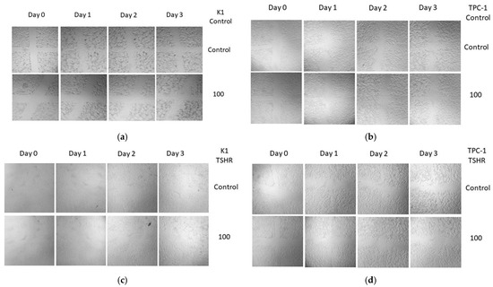 Wound-healing assay of K1, TPC-1, K1-TSHR, and TPC-1-TSHR cells treated with rh-TSH. Cells were seeded into six-well microplates, and after the formation of a confluent monolayer, scratches of equal dimensions were made using a pipette tip. Subsequently, the old medium and the debris were aspirated and replaced with a new one containing 2.5% FBS and the designated doses of the hormones. Photographs were taken every 24 h using a camera mounted on a microscope (magnification ×100). (a) Changes were not observed in either K1 or (b) TPC-1 cells following treatment with a high dose of 100 μIU/mL, and the same phenomenon was documented on (c) K1-TSHR and (d) TPC-1-TSHR cells.