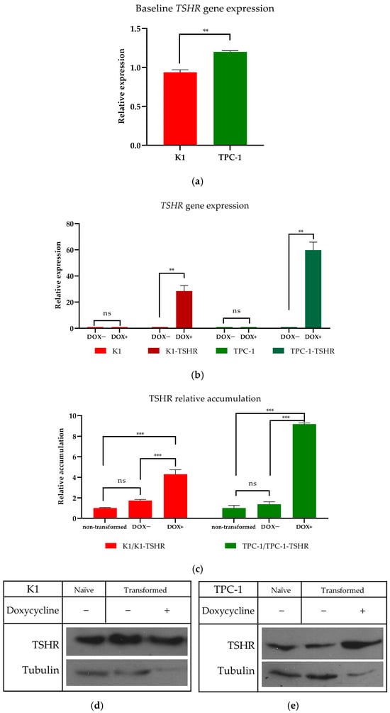 TSHR mRNA and protein expression levels following transformation with the Lenti-X Tet-on Advanced system. (a) Using qRT-PCR, the baseline expression levels of the TSHR mRNA of K1 (red bar) and TPC-1 (green bar) cells were assessed. Each bar represents the average of three experimental values (n = 3), and the error bars refer to the standard error (SEM). ** Corresponds to a p-value of <0.01. Beta-actin was used as a reference gene to normalize the data. (b) After selection of the transformed clones using the appropriate antibiotics, incubation with a dose of 3 μg/mL DOX was introduced to the transformed clones to activate the Tet-On Advanced system. Following 24 h of incubation, total RNA was isolated, cDNA was constructed, and qRT-PCR was performed. Relative expression was assessed using Livak’s model. The K1 cell line is annotated with red bars, while the K1-TSHR cells are represented with brown bars. The TPC-1 cell line appears as a green bar, while the TPC-1-TSHR cells appear as light blue bars. Each bar represents the average of three experimental values (n = 3), and the error bars refer to the standard error (SEM). ** Corresponds to a p-value of <0.01; ns corresponds to “non-statistically significant”. Beta-actin was used as a reference gene to normalize the data. (c) Following 24 h of incubation with 3 μg/mL DOX, the cells were lysed, and the crude protein extracts were analyzed using SDS-PAGE on 12% polyacrylamide gels. Western blot (WB) analysis was performed to detect the TSHR protein band. Using ImageJ, the WB results were quantified (n = 3). *** corresponds to a p-value of <0.001; ns corresponds to “non-statistically significant”. Representative Western blot images are shown of (d) K1 (e) and TPC-1. The cytoskeletal protein α-tubulin was used to normalize the results. Due to the increased TSHR synthesis, a lower amount of K1-TSHR/TPC-1-TSHR total protein extract was loaded in the gels to avoid overexposure. The graphs were prepared after normalization with α-tubulin and with consideration of the initial difference in protein quantity. Original Western Blots can be found at Supplementary Materials.