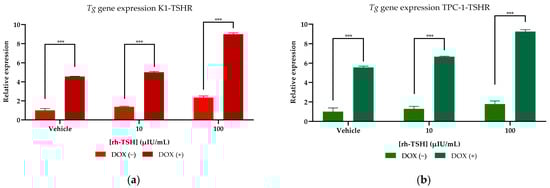 Thyroglobulin (Tg) gene expression determination of K1-TSHR and TPC-1-TSHR Cells. (a) Following 24 h of treatment with 3 μg/mL DOX, K1-TSHR-transformed cells were incubated for 48 h with the designated doses of rh-TSH. qRT-PCR was used to assess the effects of the hormone on Tg mRNA expression in K1 cells, while the same assay was performed on TPC-1 cells as well (b). All the samples were analyzed using Livak’s model, and beta-actin was used as a reference gene to normalize the data. All experiments (a,b) were conducted in triplicate (n = 3) and each bar represents the average of the three experimental values. The error bars refer to the standard error of the mean (SEM). *** Corresponds to a p-value of <0.001.